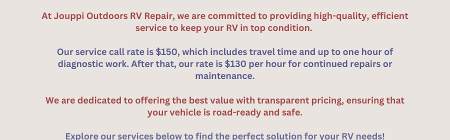 Need reliable mobile RV repair? Jouppi Outdoors RV Repair offers expert RV electrical, RV plumbing, RV roof maintenance, RV battery installation, and more—all at your location. Get back on the road with confidence!